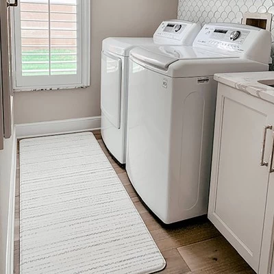 - Gray-and-white runner with the look of a designer rug and feel of a play mat