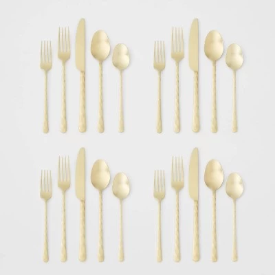 Impress your guests with the opulent look of this 20-Piece Stainless Steel Cherryfield Silverware Set from Threshold™. This gold-tone silverware set comes with service for four, including four each of dinner forks, salad forks, knives, dinner spoons and teaspoons, to meet all your serving needs for family gatherings or hosting a dinner party. These stainless steel utensils have a textured design and bright hue that will add visual interest to any table setting.