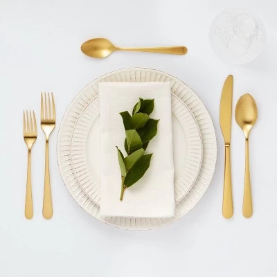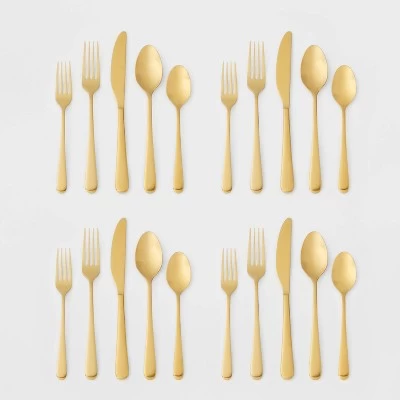 Create a luxe look for dining with the help of this 20-Piece Stainless Steel Harrington Silverware Set in Gold from Threshold™. This gold-tone silverware set comes with service for four, including four each of dinner forks, salad forks, knives, dinner spoons and teaspoons, to meet all your serving needs for family gatherings or hosting a dinner party. These stainless steel utensils have a standout design and bright hue that will add visual interest to your existing table settings.