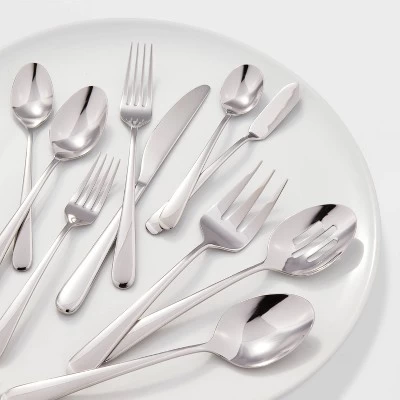 Brighten your place settings with this Stainless Steel Harrington Mirror Silverware Set from Threshold™. This silverware set comes with service for 12, including 12 dinner forks, 12 teaspoons, 12 dinner spoons, 12 salad forks, 12 dinner knives, a serving spoon, a butter knife and more, to meet your serving needs for everyday family dinners or hosting a dinner party. These stainless steel utensils have a mirror finish and modern design that will complement the look of any table setting.