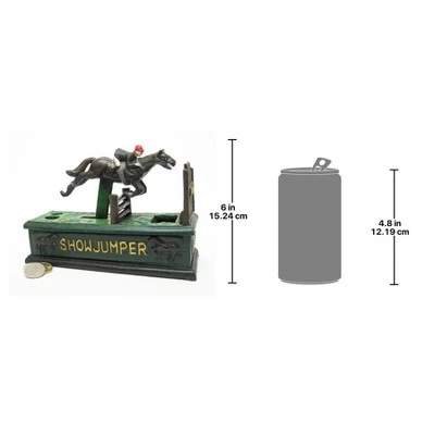 The equestrian sport of show jumping is featured in this charming collectible mechanical coin bank. The first major show jumping competition was held in England during the Horse of the Year Show at Olympia Field in 1907. Rock the horse and rider back to the starting line and place your coin in the show jumper’s mouth. Press the switch, and watch him hurdle the gate and see your coin fly into the manger trough! Our mechanical replica antique coin bank is cast in foundry iron and authentically hand painted. Our Design Toscano finely detailed replica coin bank makes a clever mechanical bank gift and a charming equestrian collectible. 9″Wx3″Dx6″H. 6 lbs.