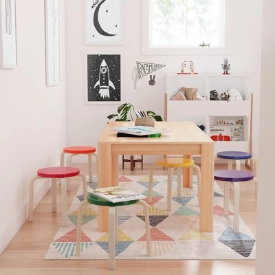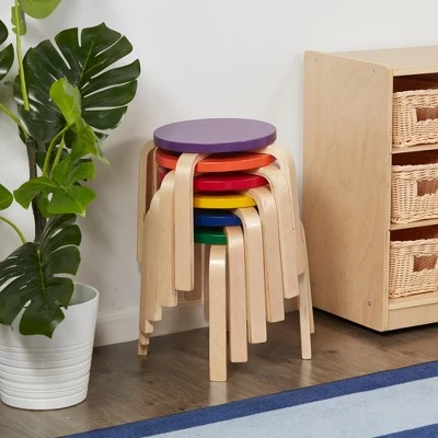 This 6-piece set of Bentwood Stools with curved wood is great for circling up or placing around an activity table to enjoy crafts, story time, or snacks. Build engaging educational spaces to promote confidence and independence with child-sized furniture. Backless stools with round tops allow students to quickly and easily pair up or work in small groups. Wooden stools feature a 12″ seat height that complements tables 18-22″ high. These children’s seats neatly stack to save space or slide under your table for a smaller footprint. The lightweight design makes it easy to move around the room for a flexible seating option, which supports a child’s need for autonomy and independence. Stools feature a smooth finish, rounded edges for safety, and felt glides to help prevent floors from scratching and reduce noise. Bentwood Stools are crafted from birch plywood that is molded into shape creating a durable natural hardwood with a tough UV lacquer that seals the wood surface and resists scratching. A UV inhibitor makes furniture resistant to ultraviolet light and yellowing. Natural birch plywood is extremely durable and will hold up to everyday use in daycares and preschools, great for the home.