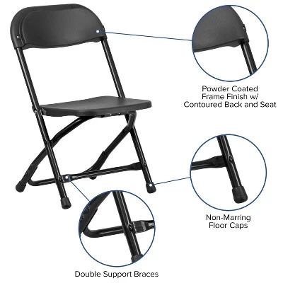 Create a space for your little one with seating that was specifically designed for them and that can be stored away with ease. This plastic folding chair will make an exciting addition to any classroom, daycare center or in the home. The textured seat ensures safe and comfortable seating. The lightweight design makes it ideal for the child to easily transport and setup for group activities, reading and other learning groupings. This child’s chair can be paired with the adult sized version for compatibility within your home. Additional Features: Double Support Braces, 18 Gauge Steel Frame, Powder Coated Frame Finish with Floor Caps, Recommended for Preschool – Kindergarten Ages, Folded Size: 13″W x 2.25″D x 25″H