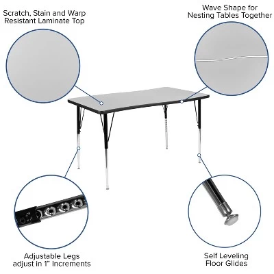Take your classroom from “yawn” boring to lively with these collaborative wave activity tables that are shaped for group learning success. Students will have plenty of working space on this 3-piece nesting classroom table with two half circle end pieces and a rectangular middle table. Complete with seating by pairing with our ergonomic shell stack chairs. Built to last through many class turnovers the thermal fused laminate top is scratch, stain and warp resistant. An attractive black powder coated finish protects the upper legs from scratches and height adjustable chrome lower legs give you the flexibility to raise or lower the table a full 9″ in 1″ increments. Self-leveling nylon floor glides keep the table from wobbling and protect your floor by sliding smoothly when you need to move it. 21st century Gen Z and Gen Alpha generations are learning at a faster pace and require modern furnishings and technology to focus their attention. Collaboration doesn’t happen only in the classroom, add this office group table in your conference room or collaborative space for team members to gather around. Create unlimited combinations using various shaped nesting activity tables in your classroom, lab, or library. Additional Features: Self-Leveling Nylon Floor Glides prevent scratches and wobbling, Recommended Grade Level: 1st Grade – Adult, Recommended Seating Capacity: 6 adults or children, Recommended Usage: home school, classroom, playroom, office, meeting spaces, Half Circle Table Size: 24″W x 47.5″L x 21.25-30.25″H ; Rectangle Table Size: 28″W x 47.5″L x 21.25-30.25″H