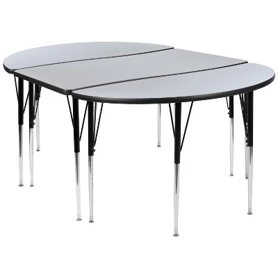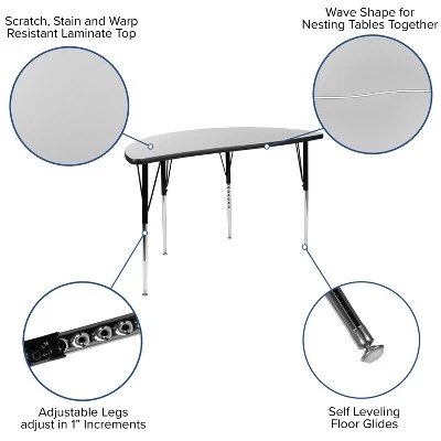 Take your classroom from “yawn” boring to lively with these flexible learning wave activity tables that are shaped for group learning success. Students will have plenty of working space on this 3-piece nesting classroom table with two half circle end pieces and a rectangular middle table. Complete with seating by pairing with our ergonomic shell stack chairs. Built to last through many class turnovers the thermal fused laminate top is scratch, stain and warp resistant. An attractive black powder coated finish protects the upper legs from scratches and height adjustable chrome lower legs give you the flexibility to raise or lower the table a full 9″ in 1″ increments. Self-leveling nylon floor glides keep the table from wobbling and protect your floor by sliding smoothly when you need to move it. 21st century Gen Z and Gen Alpha generations are learning at a faster pace and require modern furnishings and technology to focus their attention. Collaboration doesn’t happen only in the classroom, add this office group table in your conference room or flexible learning space for team members to gather around. Create unlimited combinations using various shaped nesting activity tables in your classroom, lab, or library. Additional Features: Self-Leveling Nylon Floor Glides prevent scratches and wobbling, Recommended Grade Level: 1st Grade – Adult, Recommended Seating Capacity: 6 adults or children, Recommended Usage: home school, classroom, playroom, office, meeting spaces, Half Circle Table Size: 24″W x 47.5″L x 21.25-30.25″H ; Rectangle Table Size: 28″W x 47.5″L x 21.25-30.25″H