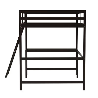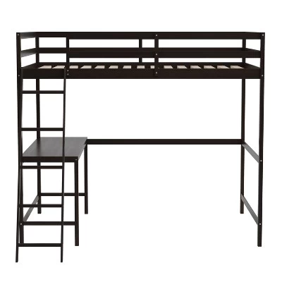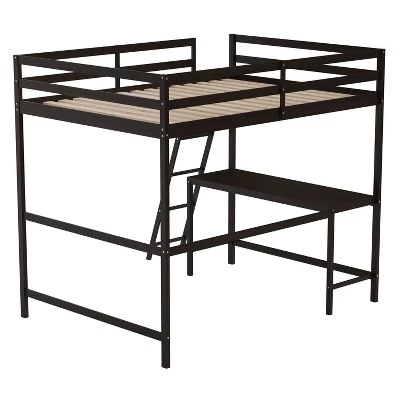 Form meets function in the clean, simple lines of this full size lofted bed frame with a built-in desk tucked behind the ladder. Perfect for children and teens this space saving design provides a designated play or study area without taking up any additional floor space. The open area beneath the lofted bed adds additional room for stuffed animals or a small dresser. Safety and durability are top priorities in any household and this lifted bed won’t disappoint. The wooden slats are securely joined with wood screws and wood dowels allowing this sturdy bed to accommodate up to 300 lbs. static weight. Protective dual guardrails ensure that sleepers stay put while they dream. Supportive wooden slats, designed to use 6″ – 8″ mattresses, are securely attached to the siderails with wood screws for a safe sleeping environment.Available in 2 finishes and easily assembled, this lifted bunk bed will blend seamlessly in any decor and wipes clean with a dry cloth. Expertly packaged in 2 separate boxes, this tall loft bed will be a welcome addition to your home.
