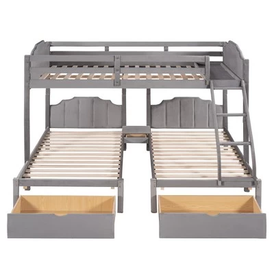 - [Multi-functional] This triple bed can be divided into three separate beds to meet your different needs. The shelf beside the upper full bed and the table with drawer between the two lower beds provide a place for you to put some daily supplies within easy reach, and the two pull-out drawers under the lower beds save space for you to store some clothes and toys.