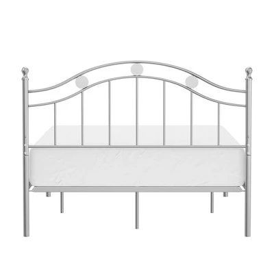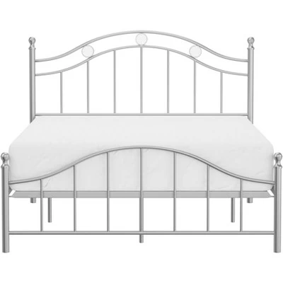 Simple and stylish, this full size bed captures clean lines in a lustrous silver finish, brightening your bedroom. Brilliant faux diamond clusters embellish the top of the headboard, adding a touch of elegance to its overall tone. This statement-making piece ensures quality rest and enduring style. Constructed of metal, this platform bed set includes a decorative metal footboard, rails, slats and support legs. No box spring required; mattress not included. Assembly required.