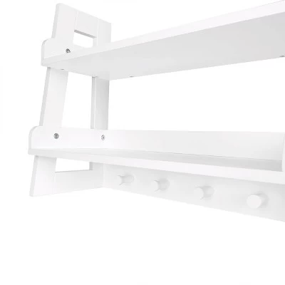 Create a sweet space to store and display your little onesâ special things with this 2-tier wall shelf. Featuring two open shelves and four hanging hooks, this wall shelf is ideal for playrooms, nurseries, and other kidâs spaces. Place picture frames, small figurines, succulents, and other dĂŠcor on the two open shelves, then hang small bags, hats, and various playtime accessories from the wooden pegs below. The open shelves also make an ideal spot to store wipes, lotions, and other nursery necessities near the changing table. Includes detailed instructions and hardware for quick and easy assembly.