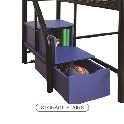 The DHP Junior Loft with Storage Steps is a great fit for your kid’s room! Made with sturdy metal, your child will love the amount of space underneath the loft as well as hiding toys inside the storage steps. This junior loft bed has the ideal height for smaller children and it is the solution you’ve been looking for to keep your little one’s room nice and tidy. Climbing up and down the steps is another amusing feature with this bed and with an affordable price, high quality and safe construction with guardrails for security, you can’t go wrong with the Junior Loft with Storage Steps. This bed comes with the Blue Curtain Set, which completes the look of the bed with peek through windows and hanging panels. The curtains create a private play area underneath the loft and the panels above have storage pockets to keep small toys and books neatly out of sight. Watch your little ones enjoy their very own fortress. This bed is made for use without a box spring. It accommodates a standard twin size mattress of maximum 8-inch height (sold separately).