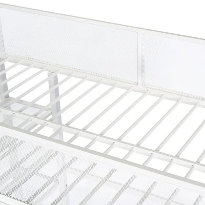 - [Modern Style] This bed is crafted from metal with a clean silhouette, horizontal slatted headboard and footboard, and matching rails to match any room decor. The raised base creates a cozy loft space for storage or play.