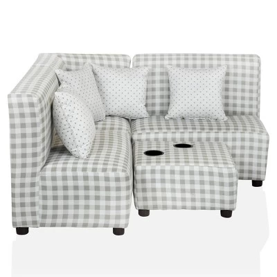 Refurnish your children’s den with this modern farmhouse style sectional. The brilliant design is both compact and modular. So it fits in small spaces and can be rearranged if you decide to move, perfect for a kids’ learning space. Transform it into a sofa, loveseat, and accent chair. It flaunts a neutral grey tone plaid pattern with patriotic star-studded throw pillows. The ottoman also features two fun cupholders.