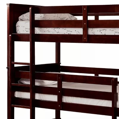 Resolve the space dilemma in the kids’ room with this triple-decker bunk bed. It offers three full beds, so each child had a spacious and comfortable sleep area. The paneled headboards and footboards with fence-style guard rails create a classic style frame. This simple design is a strong and durable bed, lasting through the maturity of the children.