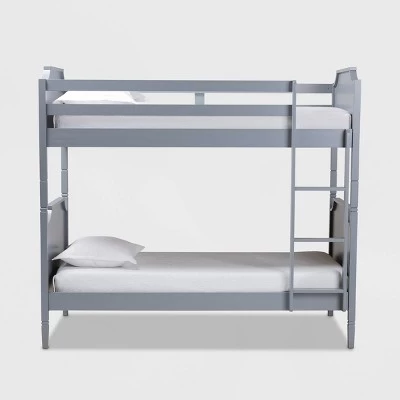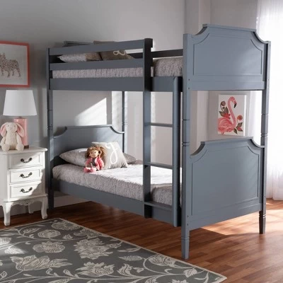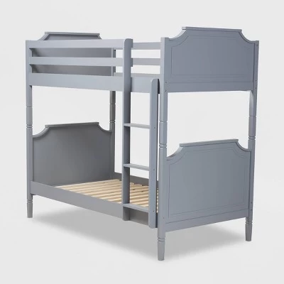 A charming and compact design makes the Mariana bunk bed a smart addition to any child’s room. Constructed from sturdy wood, the Mariana showcases a smooth gray finish that complements many color palettes. Its classic, regal look is attributed to the cut-out silhouettes on the headboards and footboards, which are further enhanced with elegant crown molding. Designed with the utmost safety in mind, the Mariana is equipped with a fixed ladder, as well as sturdy guard rails. The Mariana bunk bed is made in Malaysia and requires assembly. Dimensions: 70.55″ High x 43.7″ Wide x 78.35″ Deep; Height from Floor to Upper Bed: 52.68″ High; Height from Top of Lower Bed to Bottom of Upper Bed: 32.36″ High; Inside Dimensions (Mattress Size): 39″ Wide x 74″ Deep
