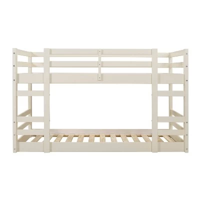 Two is better than one with Saracina Homeâs Twin Over Twin Indy Solid Wood Low Bunk Bed. Constructed in compliance with the latest safety standards, this bed frame ensures that its occupants are safe. The sturdy, solid wood construction and guard rails means that even rowdy sleepers can rest easy. A built-in, space-saving ladder is included for the top bunk, and the lower bunk rests solidly against the floor so each bed can be accessed with ease. Whether youâre sharing a small space with a roommate or your children are sharing a bedroom, this bunk bed will be there for you night after night.